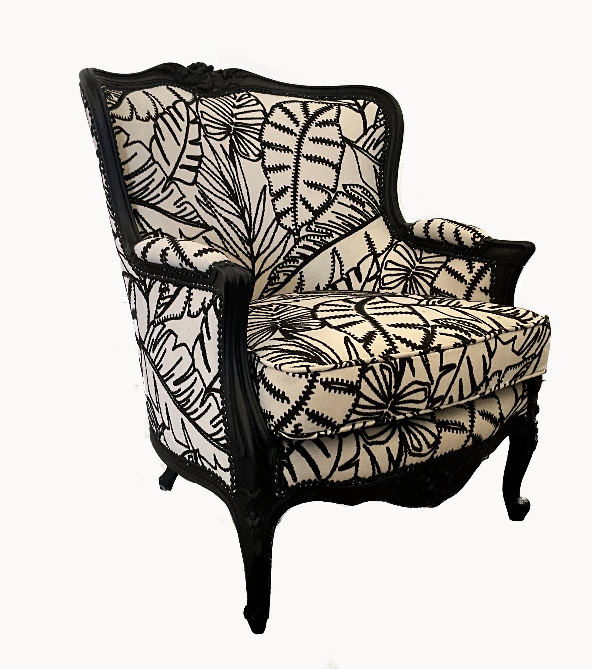 Armchair in elegant black and cream-white leaves theme fabric.